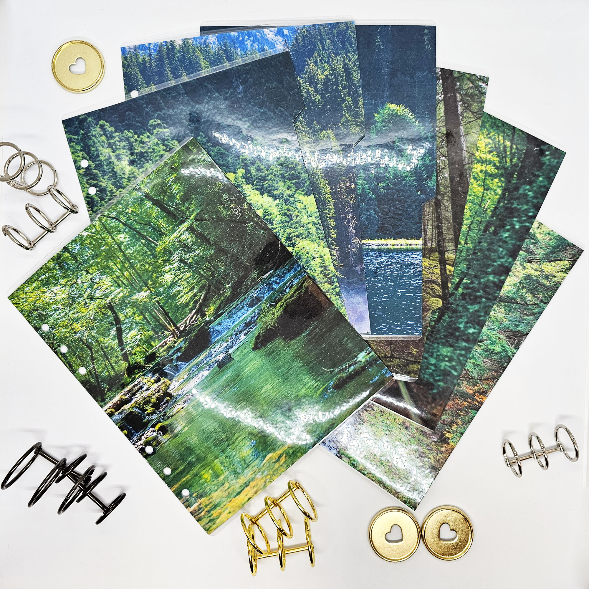 Okładka planera i pięć przekładek do wkładów planerowych w rozmiarze A5. Dwustronnie zadrukowany papier 120g/m2 folią laminacyjną 125mic. Zdjęcia lasu we mgle.